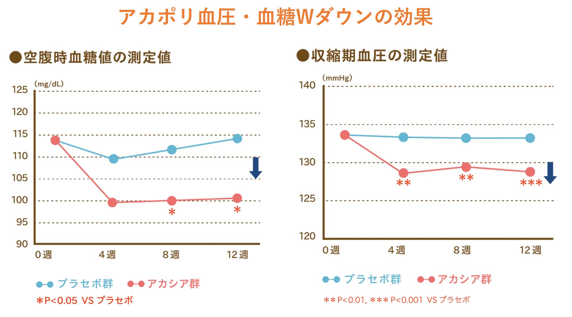 本商品の機能性届出文言は「本品にはアカシア樹皮由来プロアントシアニジンが含まれるので、収縮期血圧が高めの方の高めの血圧(収縮期血圧)を下げる機能があります。本品にはアカシア樹皮由来プロアントシアニジンが含まれるので、空腹時血糖値が高めの方の高めの血糖値(空腹時血糖値)を下げる機能があります。」となっています。この届出は実際に本商品を高めの空腹時血糖値、高めの収縮時血圧の方が服用して8週目から効果があるというエビデンスをもとに機能性を評価しています。