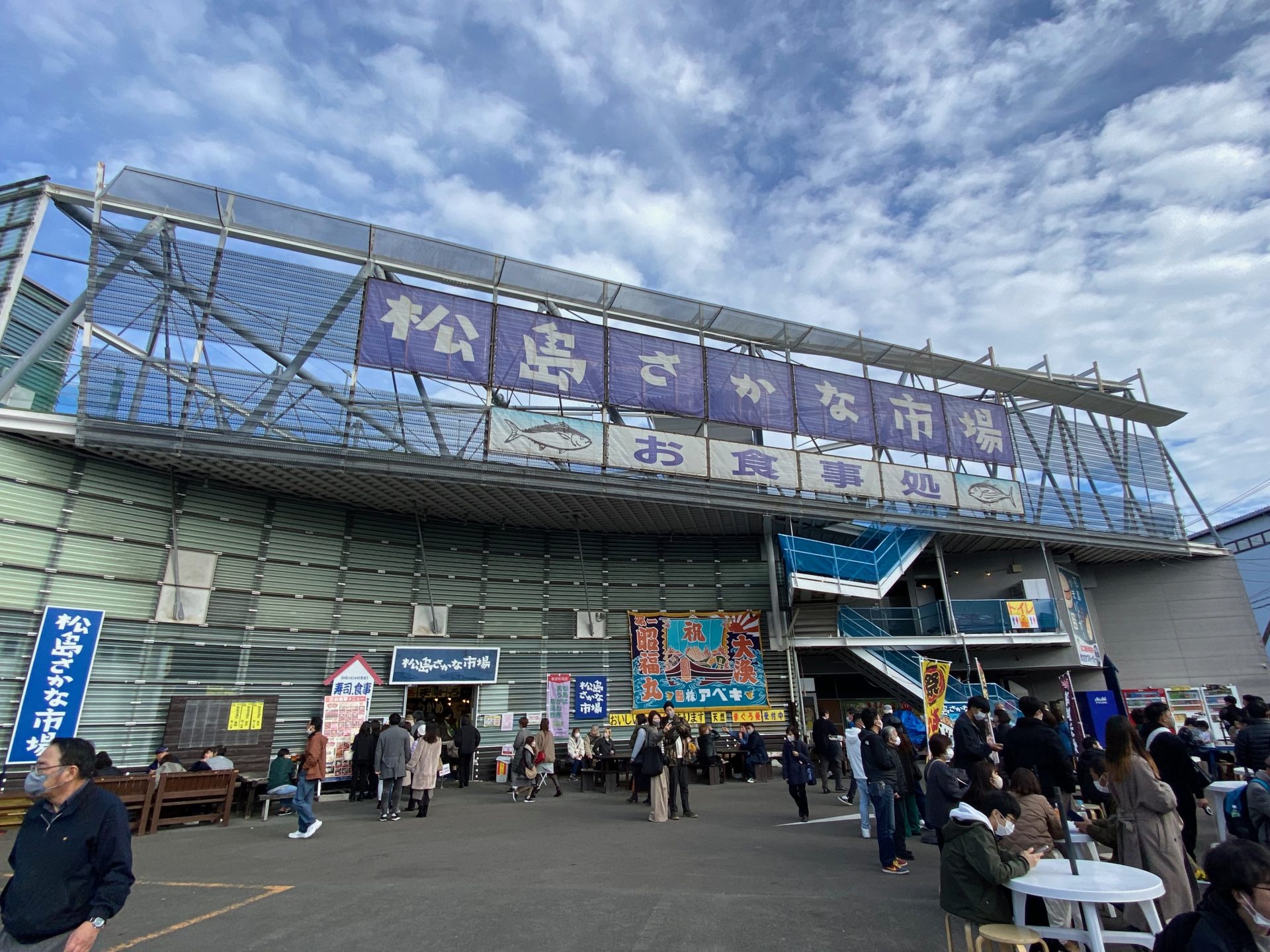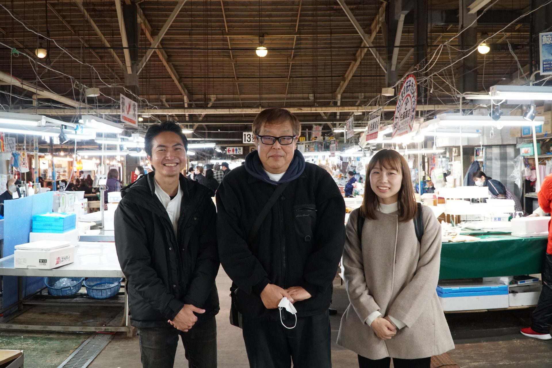 この日は高橋様にご案内いただき、松島さかな市場という観光市場に行きました。ここには漁業市場もあり、一般の人も自由に訪れて新鮮な魚介類を買うことができます。「焼がきハウス」もあり、とれたての新鮮なかきをその場で焼いてくれるので、アツアツのかきをいただくことができました。普段広島のかきを食べなれている社員も味や粒の大きさの違いを体感していました。