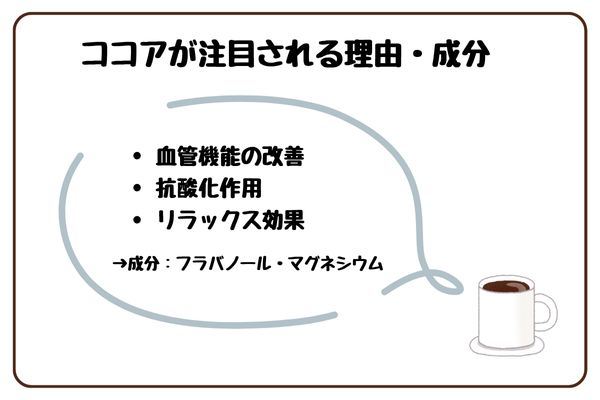 ココアが注目される理由は、カカオ由来のフラバノール(ポリフェノールの一種)とマグネシウムを豊富に含み、血管機能の維持・抗酸化作用・リラックス効果など多面的な健康メリットが期待できるためです。