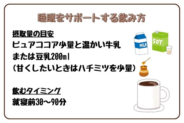 マグネシウムが神経を落ち着け、テオブロミンがリラックス感を与えるため、寝つきを良くする可能性があります。ただし調整ココアは糖分過多で逆効果になるため、無糖ピュアココア+温かい牛乳や豆乳を、就寝30〜90分前に飲むのが理想的です。