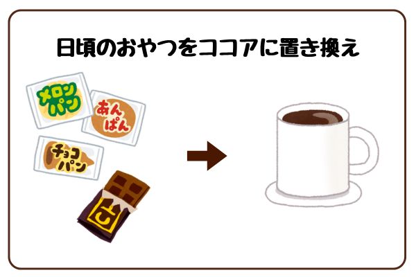 たとえば、午後のおやつタイムに砂糖入りのお菓子の代わりに無糖ココアを飲むのも一つの方法です。