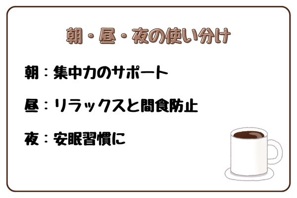 ココアは朝・昼・夜で目的に応じて使い分けると効果的です。朝は集中力サポート、昼はリラックスしつつ間食防止、夜は安眠につなげる習慣として役立ちます。