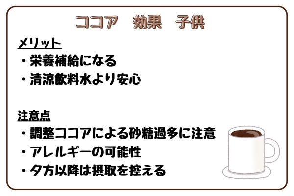 ココアにはコーヒーの約1/20程度ですが、微量のカフェイン(10〜20mg/100g)が含まれています。敏感な子供では眠りにくさにつながる場合があるため、夕方以降の摂取は控えるのが安心です。
