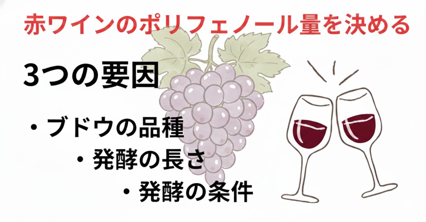 同じ赤ワインでも、ポリフェノール量には大きな幅があります。この量を決める要因は次の3つです。