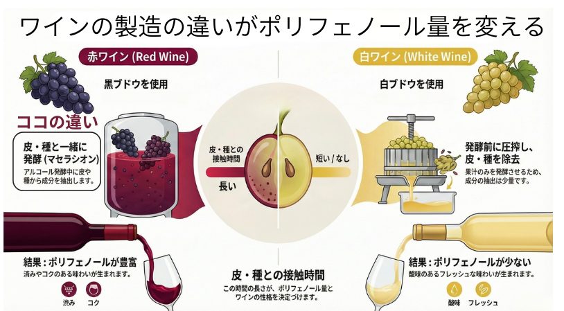 なお、白ワインでも皮と接触させるスキンコンタクト製法などは、通常の白よりポリフェノールが多くなる例もあります。つまり、差を決めているのは「色」ではなく「製法」であることが本質なのです。